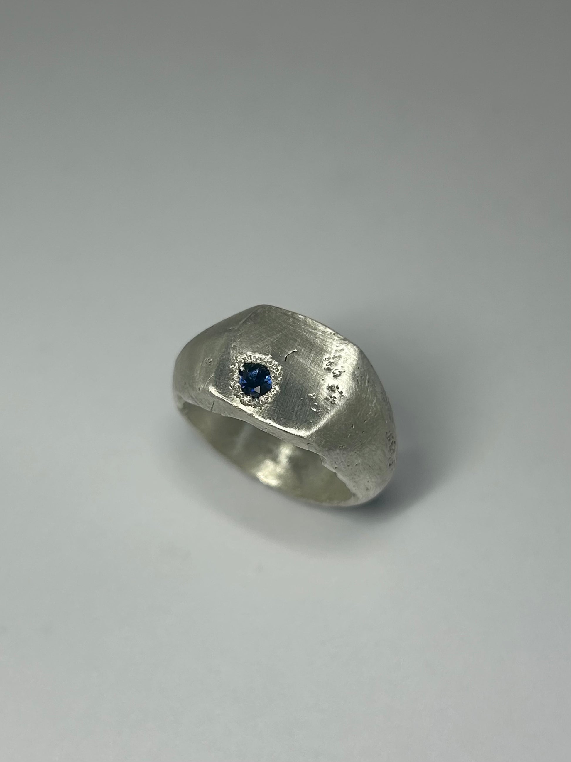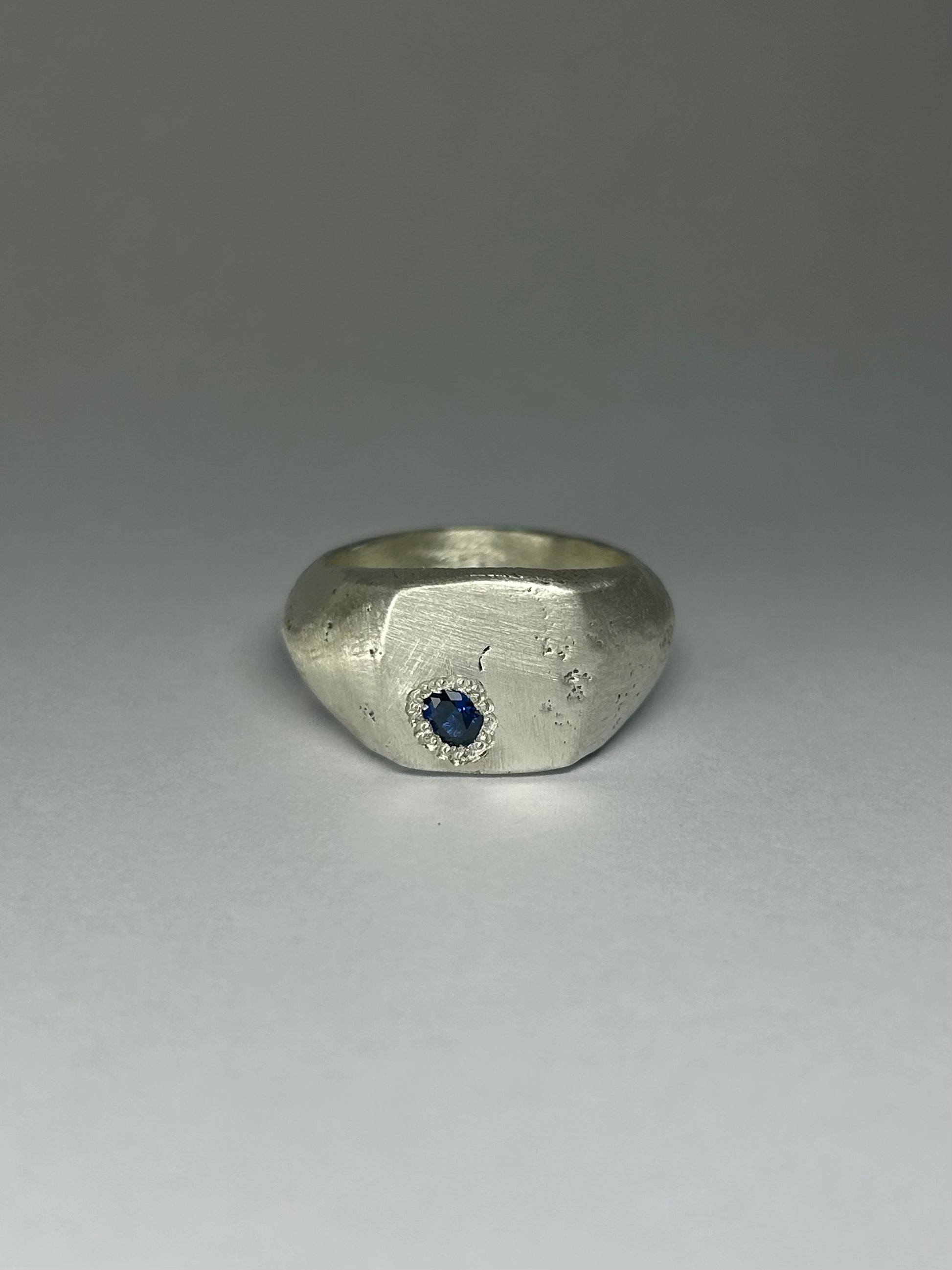 -Signet ring handmade with lab sapphire and solid sterling silver with a rough finish
